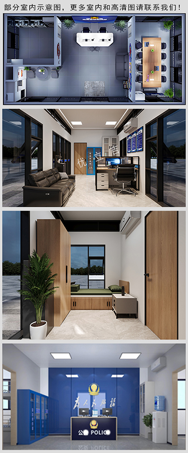 定做尺寸和布局:可定做各种大小尺寸(推荐常用尺寸:大款长12米*宽3.6米*高3.8米、中款长8米*宽3.2米*高3.4米、小款长6.5米*宽2.8米*高3.1米)、一层和二层款式都有,特殊情况可散料现场组装施工。布局有:大通间、办公区、休息值班区、接待区、自助服务区、会议室、装备仓库、洗漱区、监控室等等,按照用户需求自由布局。