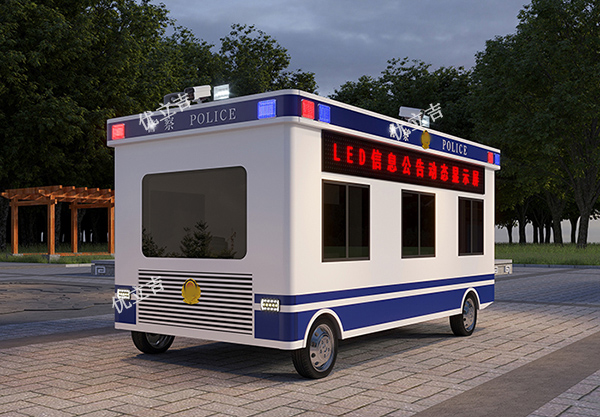主要构成材料和配置:全部采用国标材料;热镀锌钢材结实龙骨(客车或房车底盘)、外墙美观干挂墙板(四明治车体)、防火保温隔热板、内墙防撞金刚护墙板、地面耐磨磁砖(木地板)、铝板吊顶、断桥铝真空门窗、彩色LED屏、四路监控摄像机、网络设施、喊话喇叭、石墨烯电地暖、空调、爆闪灯、办公家具、警用装备柜、各种警标识牌、巡逻无人机巢等等。